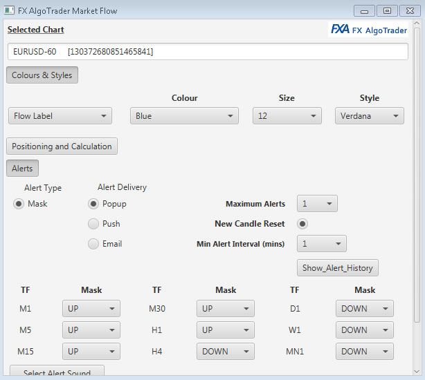 The new JavaFX inteface version of the Market Flow indicator now allows traders to define an 'alert mask' so that the trader receives an alert when the market flows match the trader's flow mask pattern. The alert masks allow traders to identify dip buying and rally selling opportunities in trending markets.