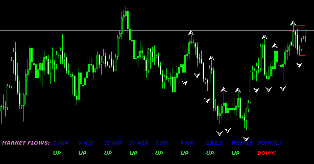 Market flow attempts to model the institutional order flows in the forex market. The Market flow indicator monitors multi-timeframe fractals and determines where price action is in relation to the specific fractals. If price action breaks through a previous support level, market flow on this timeframe is deemed to be down. Conversely, where price action breaks through a level of resistance - the flow on this timeframe is deemed to be up.